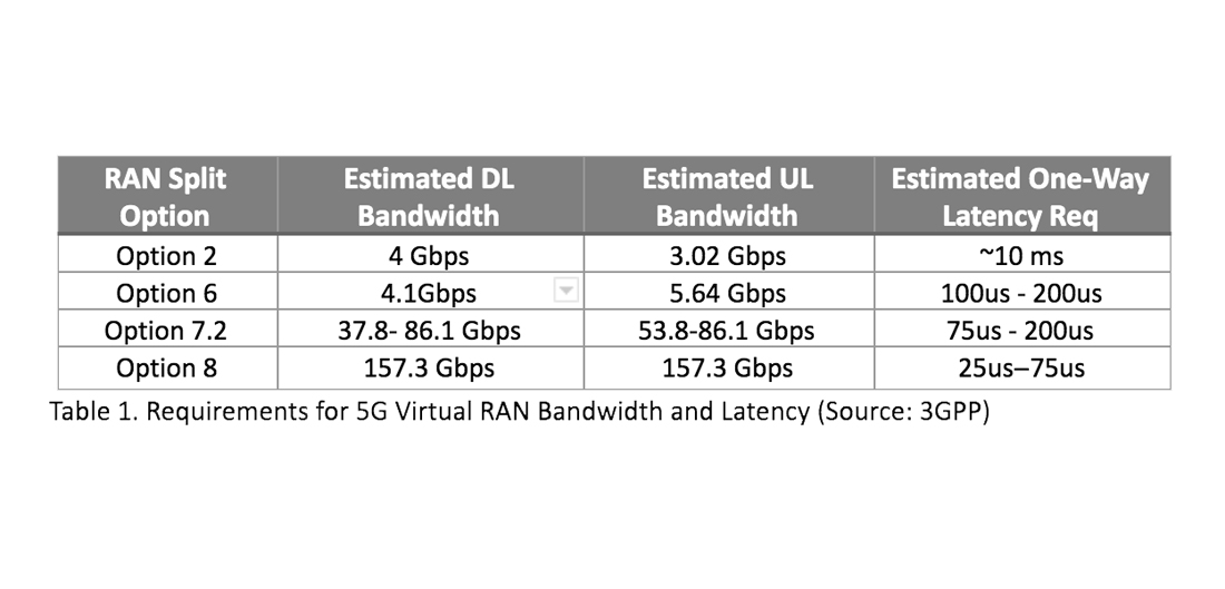 For midhaul and fronthaul the answer is more complicated because each RAN virtualization option has different latency and bandwidth requirements (table), and wireless operators have not settled on one split option. Moreover, although LTE utilizes individual wireless spectrum channels of up to 20 MHz each, 5G expands channel widths to 100 MHz and greater, which increases the amount of bandwidth needed to serve a cell site by up to 5x.