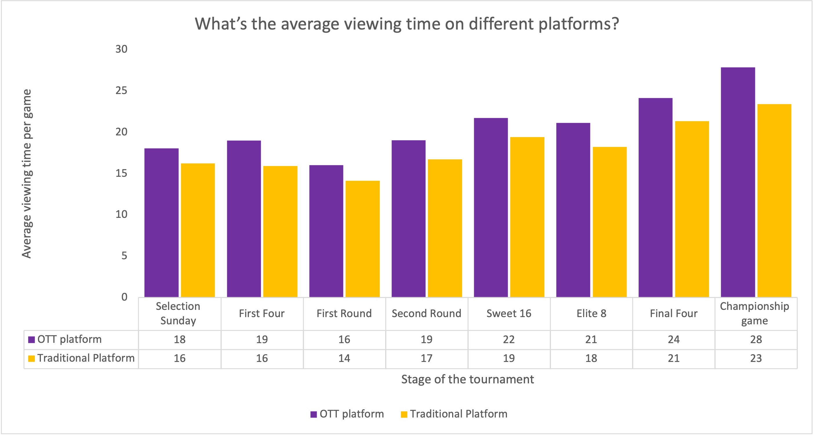 Linear TV continued to account for the bulk of March Madness viewership, with over 8 in 10 households engaging through traditional channels. But OTT and streaming audiences for sports programming has grown significantly - and continues to grow. Not only are more people tuning in through OTT, but OTT audiences are more engaged than traditional audiences when watching the game.