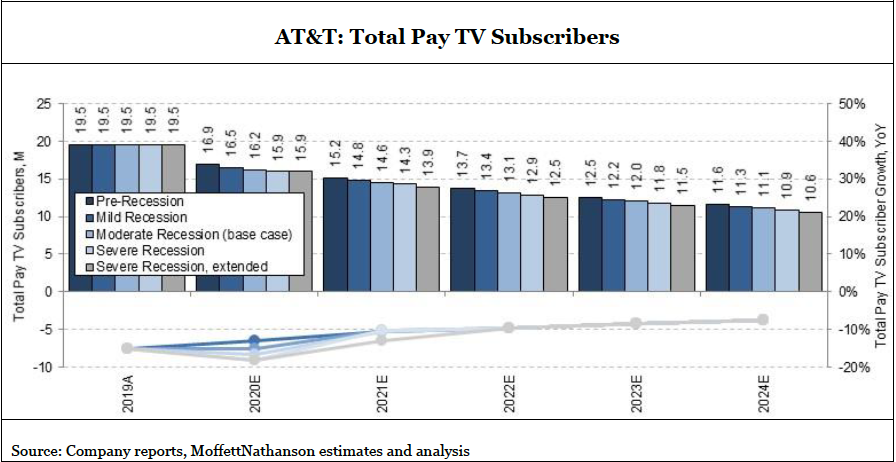 Moffett predicts that instead of an earlier prediction, which called for AT&T’s pay TV base to shrink by 13.1% in 2020 to 16.9 million subscribers, he believes it will now decline by 16.6% to 16.2 million customers.