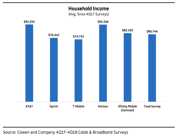 For another, with the average Xfinity Mobile subscriber backed by a household income of $82,103, the service’s customers are poorer than those for wireless market leaders Verizon and AT&T, but richer than those of Sprint and T-Mobile.