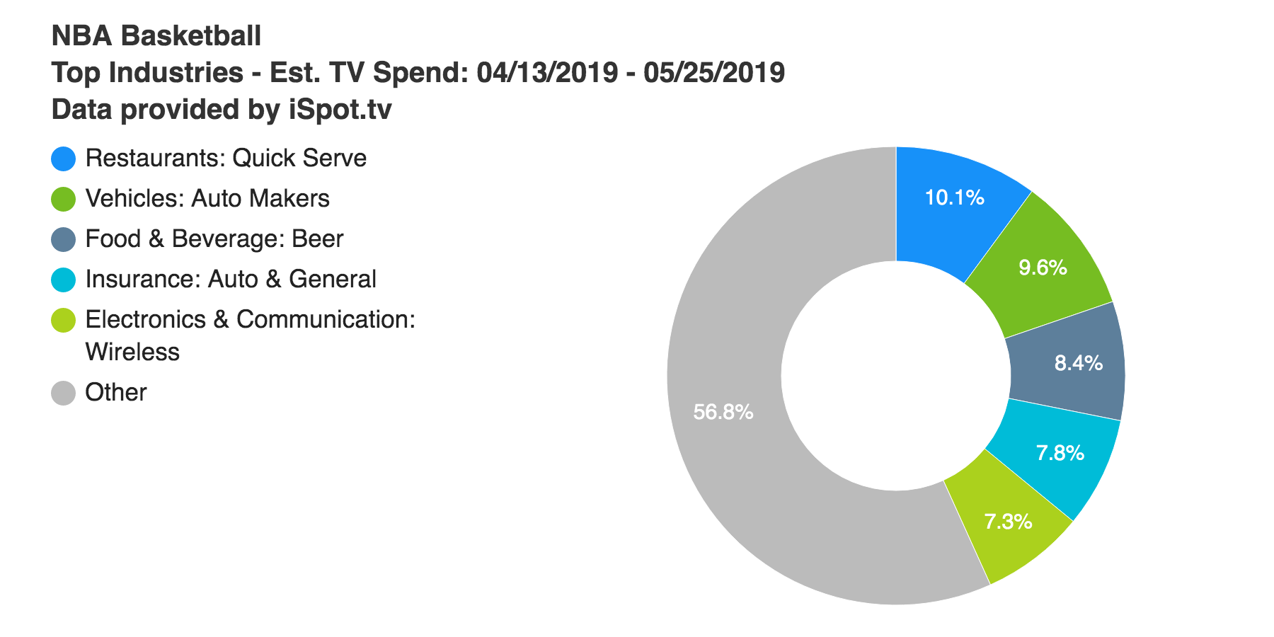 From the start of the first round on April 13, through the end of the conference finals on May 25, the NBA Playoffs generated 29.5 billion ad impressions on an estimated TV spend of $624.9 million, according to TV ad measurement and attribution company iSpot.tv. Top brand advertisers for the playoffs to this point have included Progressive (estimated $18.1 million), AT&T Wireless ($17.6M), Kia ($16.1M), Corona Extra ($16M) and Burger King ($15.1M). In total, 15 different brands have spent at least $10 million on NBA Playoffs advertising so far.