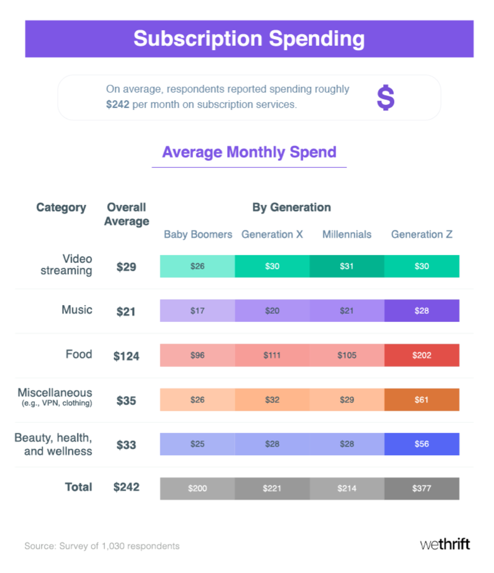 Also worth looking at is a new study by WeThrift, looking at all the subscription services we pay for, from streaming video and music to food, clothing and beauty services, results broken down by generation.