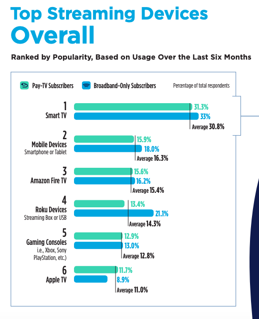 Mobile devices powered by Apple’s iOS and Google’s Android software are used for 16.3% of streaming usage, TiVo said. Gaming consoles (12.8%) and Apple TV devices (11%) are also popular choices.