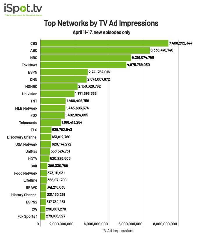 CBS stays on top of our ad-impressions-by-network ranking from April 11-17, with nearly 15% of TV ad impressions during the period. On the week, three different CBS programs accounted for at least 500 million impressions, including The Price Is Right, The Young and the Restless and the CMT Music Awards.