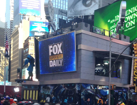 In New York City, there will be a large 40 by 40 foot set with 8,100 feet of usable space that rises 44 feet above street level on Father Duffy Square in Times Square bounded by 46th and 47th Street and Broadway and 7th Avenue. It has 62 feet high towers with Fox Sports signage, a 16 foot high animated Cleatus robot, massive video boards and LED screens, and asimulated stadium on its roof.